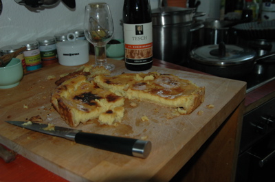 Da hatte ich mir gedacht, ich probiere mal aus, wie so eine Limetten-Zitronentarte in Kombination mit einer Nahe-Riesling-Spätlese harmoniert. Tja, statt Tarte dann eher Pustekuchen. Ich habe extra den Mürbeteig mit Eiweiß eingepinselt, damit der Teig sich nicht mit der flüssigen Füllung, bestehend aus Limetten- und Zitronensaft, Sahne, Eiern und Zucker, mischt. Mürbeteig mit Eiweiß vorgebacken, Füllung rein, Füllung läuft über bzw. hinter den Teig …