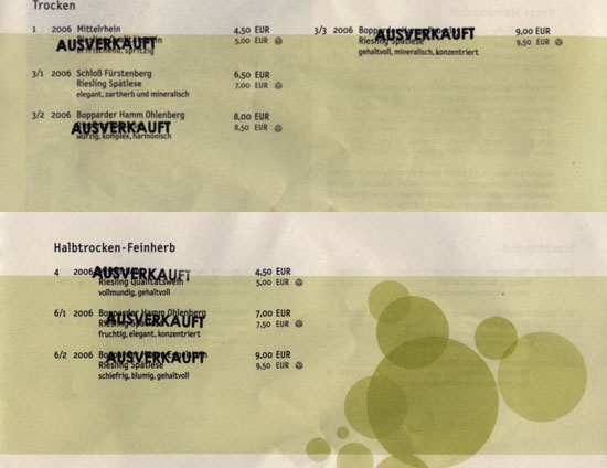 Das war eine gute Entscheidung, denn der Herr Weingart ist praktisch restlos ausverkauft und das, obwohl Gault Millau und Eichelmann und so noch gar nicht erschienen sind. Wenn die erscheinen, gibt es bei Weingarts nix mehr zu holen. Also aus dem gesamten Angebot an trockenen und halbtrockenen Weinen gab es nur noch die »Schloß Fürstenberg Riesling Spätlese« trocken. Dann noch alle süss-fruchtigen und Auslesen, Trockenbeerenauslesen usw. Die Kabinettweine? Alle weg. Die Spätlesen aus den Bopparder Lagen ebenso.