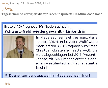 Dafür liebe ich Blogs … 27/Jan./08 von Christoph Raffelt Kommentare 2 Dass es immer jemanden gibt, der so was sieht und einen Screenshot macht, bevor es wieder verschwindet. via