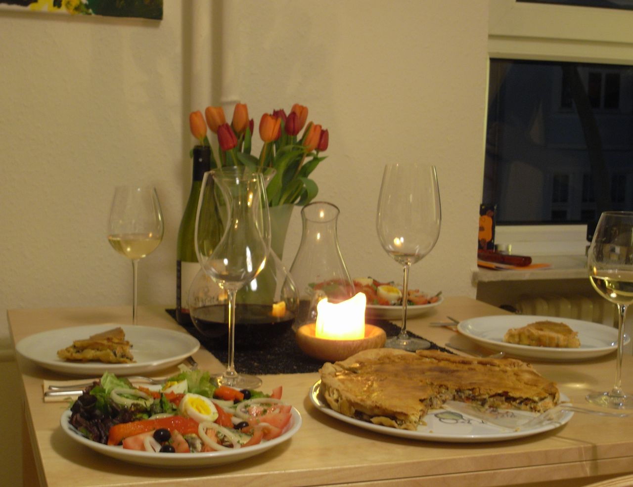 Dazu hatte ich einen Salat gemacht mit warmen Paprikas und Sardinen in einer Senf-Vinaigrette sowie eine Tarte mit verschiedenerlei Pilzen, Lorbeer, Thymian und Ziegenfrischkäse.