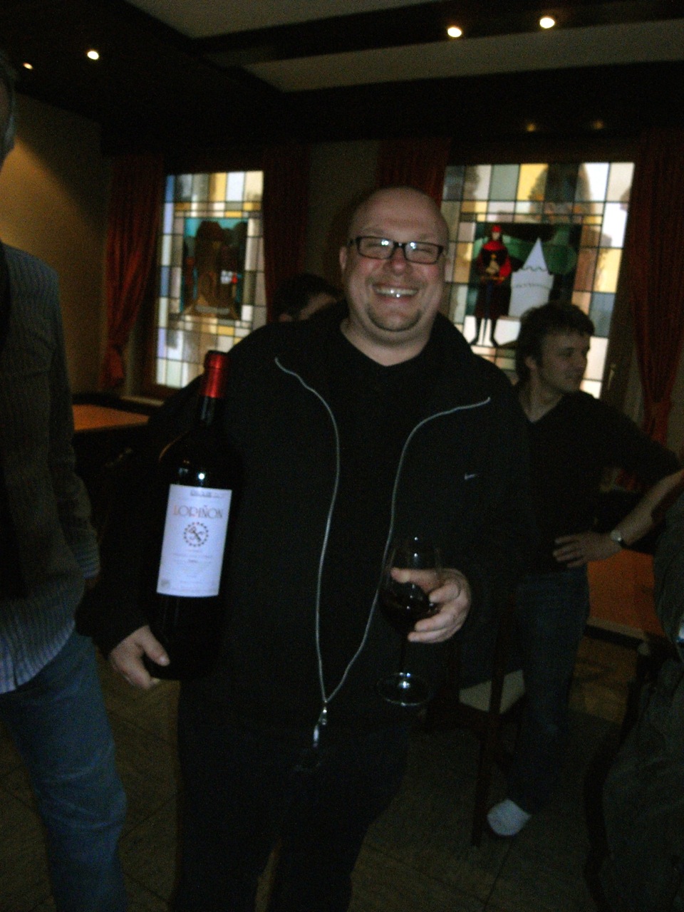 An diesem Abend habe ich reichlich getrunken (Apfelwein mit Quitte, Lorinon Crianza aus der Fünf-Liter-Amphore, Syrah von Gres-St.Paul, Chateau Liversan, Glaaberger (?) Pils und fränkischer Bierbrand.