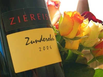 Ich kann mir das bildlich vorstellen. Es ist Herbst 2006, das Weinjahr fing gut an, doch zum Schluss konnte man zuschauen, wie die Beeren auf Grund des Regens an ihre Stöcken verfaulten. Das war nix mit den tollen, außergewöhnlichen Weinen, die man produzieren wollte, dem Spätburgunder, dem Markgräfler Syrah auf Topniveau. Also was tun in seinem Frust? Das sitzen Hans-Peter Ziereisen und seine Getreuen beisammen mit einer Menge Trauben, die trotzdem verarbeitet werden wollen, und sie denken: Zunderobsi! Wir schmeißen’s zusammen, was soll’s denn? Denn Zunderobsi ist der alemannische Begriff für Durcheinander oder Gemisch. Und das ist es, was sie getan haben. 60 % Syrah und 40 % Spätburgunder. Fürwahr eine außerordentliche Mischung.
