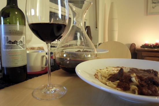Zu Wynns 1998er Michael Shiraz gab es einen ernsthaften Woody Allen Beziehungsfilm aus der englischen Upperclass. Dazu passt der Wein nicht wirklich, da hätte man vielleicht eher einen Bordeaux trinken wollen. Zum dargereichten Ragout vom Hirsch mit handgefertigten Tagliatelle allerdings harmonierte dieser perfekt ausgereifte Shiraz außerordentlich. Ich habe, glaube ich, zuletzt beim Konsum des 1991er Penfolds 389 einen so harmonischen australischen Syrah getrunken.