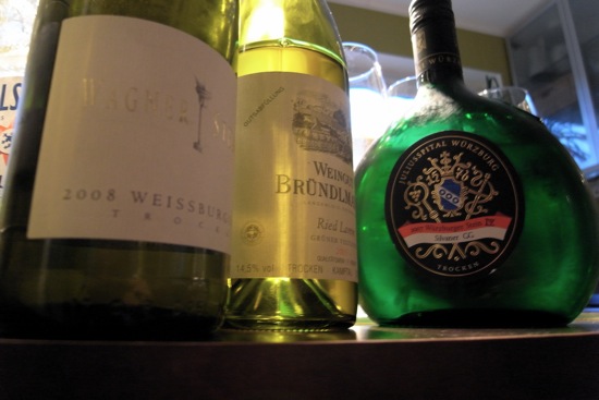 Wir wollten mal drei Weine dazu verkosten und haben uns für weißen Burgunder entschieden, ganz frisch, 2008 aus dem Hause Wagner-Stempel, länger im Keller gelagerten Grünen Veltliner von Großmeister Bründlmayer, den 2003er Ried Lamm, und dann, wie sollte es anders sein, Silvaner, in diesem Fall ein Großes Gewächs 2007, Würzburger Stein vom Juliusspital.