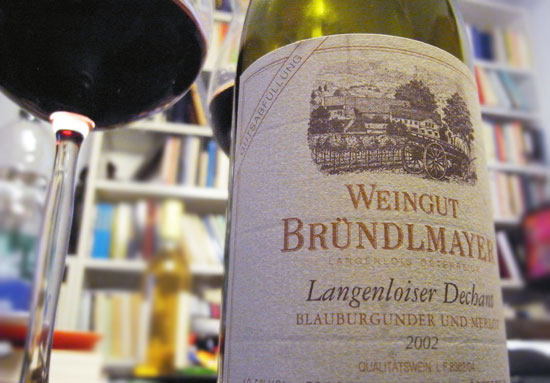 Er kann aber nicht nur Weiß, er kann auch Rot. Der Pinot Noir, der den Namen seiner Tochter Cécile erhalten hat, ist ein Beispiel. Oder das Blauburgunder-Merlot-Cuvée aus dem Langeloiser Dechant. Ein kleine Restmenge davon gab’s beim Spezialisten für Restgebinde und ich muss gestehen, ich hätte lieber den aktuellen 2003er probiert. Der 2002er zeigt ein wenig sein Alter, schafft den zweiten Abend kaum und wirkt etwas stahlig im Mund. Trotzdem, am ersten Abend ist er sehr schmeichend mit Waldbeerfrucht und Kirschen, mit ein wenig Unterholz und leichten Kräutern. Ein klein wenig Holz gibt Struktur und ein klein bisschen geröstet wirkt er, speziell am zweiten Abend.