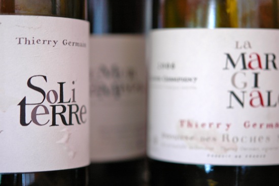 In der Mitte der Abteilung steht dann ein Korb mit dem Cabernet Franc, den ich am Abend zuvor getrunken habe, diesmal mit weißem und nicht mit violettem Etikett, und außerdem ein Weißwein namens Soliterre. Er kostet knapp 13 Euro, liegt damit 3 Euro unter L’Insolite. Wie auch der Saumur Champigny firmiert dieser Wein nicht unter dem Namen der Domaine, sondern unter dem des Eigners, Thierry Germain. Auf der Website der Domaine taucht auch er auf.