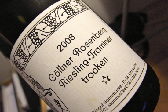 Eigentlich könnte das spannend sein. Die lebendige Spritzigkeit, Zitronenfrucht und Säure des Rieslings und die blumigeren Düfte des Traminers, die filigranen Rosennoten und leichten Muskatanklänge. Der Wein aus dem Cöllner Rosenberg wird trocken ausgebaut und, ehrlich gesagt, glaube ich, dass es ihm besser getan hätte, wenn er ein wenig mehr Restsüße mitbringen würde. So bleibt er ein wenig zumindest hinter meinen Erwartungen zurück, wirkt ein wenig zu fragil und leicht und auch das Zusammenspiel von Aromen und Säure verschwindet allzu schnell, um ungetrübt Freude zu bereiten.
