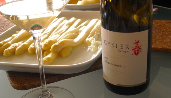 Ich kam ziemlich abgehetzt in Goch an, hatte viel länger gebraucht für die Strecke und das Essen stand schon auf dem Tisch. Spargel satt, Schinken satt, zerlassene Butter satt und ich konnte frischen 2009er Silvaner von Alexander Gysler mitbringen. Ein herrlich stoffiger Gutssilvaner ist das geworden mit einer schönen Kräuternote und ordentlicher, leicht salziger Mineralität. Zu diesem Gericht eine kongeniale Ergänzung.