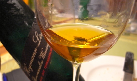 Die Auslese aus dem Herrenberg von Maximin Grünhaus stammt dann nicht aus dem Jahr 1990, da hat unser Gastgeber im Keller daneben gegriffen oder irgendwann falsch einsortiert und dies erst gemerkt, als die Flasche schon geöffnet war. Wir trinken also eine 1988er Auslese, die zunächst einmal so riecht, als habe jemand Geranien frisch umgetopft und mit Eistee begossen, in dem ein wenig aufgeschnittener Apfel schwamm. Stoffig wirkt die Auslese, mit markanten Noten von Quitten und Apfel, allerdings kann sie den Geruch des Umgetopftseins nicht ganz abstreifen.