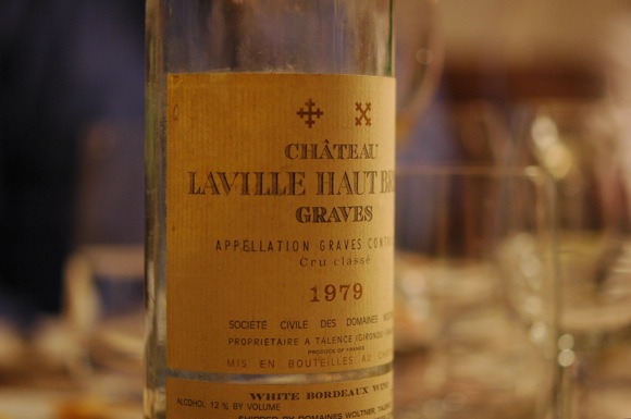 Neben diesem 2005er stand ein Wein, der zwar in der Nase deutliche Alterungsnoten aufweisen konnte, im Glas aber hell schimmerte ohne jeden Alterungston. Auf einen 1979er Château Laville Haut Brion, heute La Mission Haut Brion, ebenfalls Graves, ebenfalls Sauvignon Blanc, ist am Tisch natürlich niemand gekommen. Durchaus amüsant und durch die Bank zutreffend waren die Geruchsvergleiche mit Tahin und Zitrone, Käse oder Kettenfett, gekochtem Gemüse und Karamell. Stand Tahin und Kettenfett zu Beginn im Vordergrund wurde der Wein über die nächsten Stunden nicht schwächer und müder, nein, im Gegenteil formte sich ein karamelliger Wein mit ausgezeichnetem Säuregerüst mit zunehmender Weichheit und Finesse. Sehr beeindruckend.