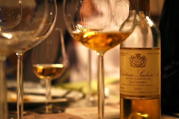 Zum Schluss noch mal ein Höhepunkt eines feinen Weinabends: Château Suduiraut, Sauternes, 2003. Was für ein genialer Tropfen. Eine nicht enden wollende dichte Süße, eine crémige Karamellbonbonessenz mit eingelegten Früchten voller gebändigter Kraft und Dichte. Und das, was einen bei vielen Sauternes befürchten lässt, man müsse ob der Schwere durch die Decke plumpsen wird hier gekontert mit Frische, mit einem feinen Säuregerüst, was mir bei diesem Château wie bei kaum einem anderen immer wieder auffällt und die Weine unwiederstehlich macht: Da schwebt eine riesige, mit eingelegten Früchten durchsetzte Crème Brullée in einem schweren Tongefäss wie auf einem Magrittschen Gemälde schwerelos über den Dingen. Großer Wein, großartiger Abend.
