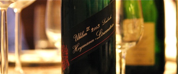 Was nach den drei Runden Pessac-Léognan wiederum verdeckt ins Glas kam war ein Wein, der von einem der bevorzugten Winzer unseres Gastgebers stammt. Der 2003er Uhlen Laubach von Heymann-Löwenstein, Terrassenmosel, hat uns ebenso viel Spaß bereitet wie die Bordeaux. Dieser Wein aus dem Hitzejahrgang wirkte überhaupt nicht müde – beim kürzlich genossenen 2003er von Clemens Busch konnte ich davon auch nichts feststellen. Der leicht nach Virginiatabak und Pfirsich duftende Wein hatte zwar naturgemäß keine überbordende Säure, aber eine, die den Wein sehr gut zusammengehalten hat. Leicht karamellig wirkte der Wein, mit kräutriger Mineralik, leicht herben Johannisbeer-Noten, einer deutlich spürbaren Restsüße und ausgezeichneter Länge.