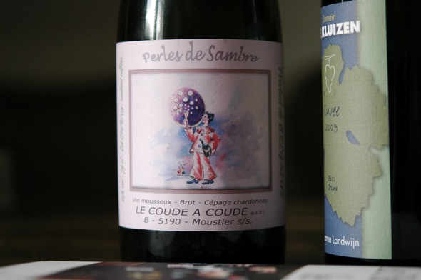 Der Chardonnay Brut Perles de Sambre 2006, 2008 ausgezeichnet mit einer Silbermedaille beim Mondial du Bruxelles, stammt von Schieferlagen um Moustier sur Sambre, was irgendwo zwischen Charleroi und Namur liegt. Le Coude a Coude scheint, wenn ich das auf der Website richtig interpretiere, eine Gruppe von Weinfreunden zu sein, die reichlich feiern können und neben der Organisation ihrer Feiern auch Fruchtsaft, sowie einen stillen Chardonnay und eben diesen Vin Mousseux herstellen. Ob dieser Wein nun im traditionellen Verfahren hergestellt wird, kann ich nicht erkennen, doch was klar wird: trotz der Hemdsärmeligkeit, mit der der Wein hergestellt zu sein scheint, hat er durchaus Charakter. Es findet sich eine angenehm hefig-fruchtige Grundnote, ganz gut balanciert, schöne Crème, schöne Länge. Das gefällt mir.