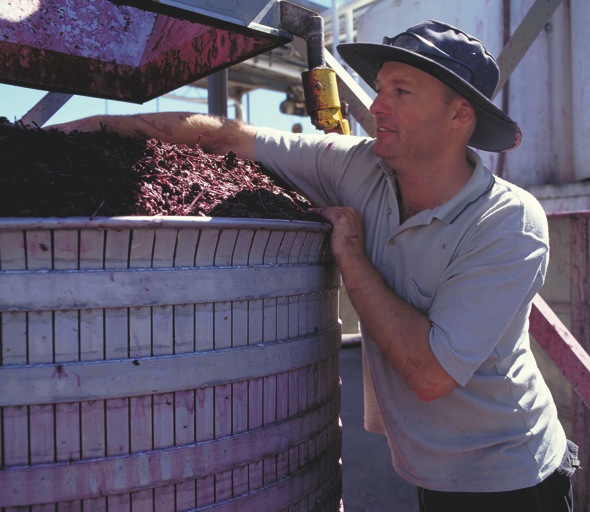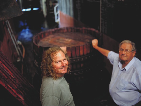 Der heutige Chief Winemaker ist Chester d’Arenberg Osborn (hier links), der sein Handwerk von Kindesbeinen an bei seinem Vater d’Arry (hier rechts) gelernt hat, der wiederum immer noch im Betrieb mitarbeitet. Nach Abschluss der Schule ist er einige Jahre durch verschiedene andere Betriebe in Australien und Europa getingelt, wie man das so macht, wenn man gut werden will, und setzt sein Konzept vom Weinmachen seit 1984 zu Hause um. Dieses Konzept ist sehr klar: traditionelle Weinbereitung und Weinbergsarbeit. Keine chemische Düngung, geringe Erträge, extensive Bodenbewirtschaftung. Sämtliche Weine werden mit alten Korbpressen gepresst. Die Pressen, mit denen The Dead Arm Shiraz aus den über hundert Jahre alten Weinstöcken gepresst wurde, eine Coq und eine Tregoning, stammen selber aus dem 19. Jahrhundert. Selbst die offene Fermentation und das Bearbeiten der Maische mit den Füßen wird hier für die teuren Weine des Hauses noch angewandt. Erstaunlich, bei einem doch relativ großen Betrieb. Wenn man dagegen in die kilometerlangen unterirdischen Fabrikhallen von Penfolds schaut, erlebt man praktisch einen Kulturschock.