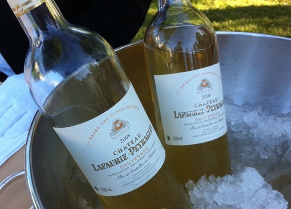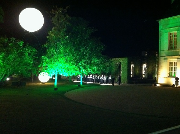 Nichts desto trotz wäre, um dem Rahmen gerecht zu werden, ein Smoking durchaus angemessen gewesen. An diesem Abend, man erwartet das ja bei Bütten und Goldrand, wird nicht gekleckert. Schon der Weg zum Innenhof des bemerkenswert schönen Schlösschens wird gesäumt von Hostessen die zu nichts anderem da zu sein scheinen, als mich anzulächeln und den Weg zu weisen. Im Innenhof stehen, um einen Turm herum gruppiert aus dem dezent einige Fotografen ihre Chipkarten füllen, sechs Stationen, an denen je drei unterschiedliche Sauternes ausgeschenkt werden während futuristisch anmutende Häppchen gereicht werden. Beispielsweise Bille de foie gras et rhubarbe à la baie rose oder Oeuf en chaus froid vinaigrette xérès et sirop dérable, einem eratischen Eischaum in Originalhülle, sprich mit dem Strohhalm aus dem halb geköpften Ei gesogen.
