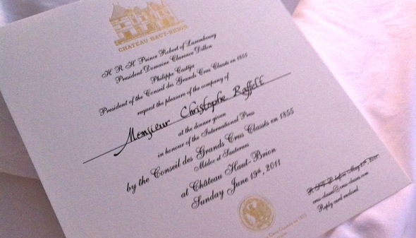 Während sich das Fußvolk, zu dem ich mich eigentlich zugehörig fühle, an so einem Messeabend die örtlichen Weinbars und Brasserien überfällt oder von einem Händler oder Winzer eingeladen wird, gibt es eine auserlesene Zahl von Weinfreunden, die auf die hiesigen Schlösser geladen werden. Sonntags lädt Haut-Brion, montags Rothschild, dienstags ich weiss nicht wer.