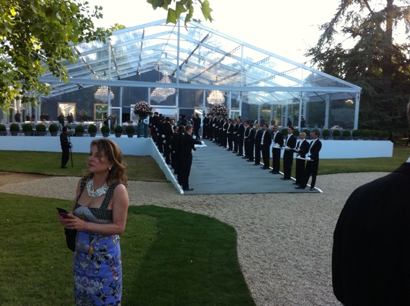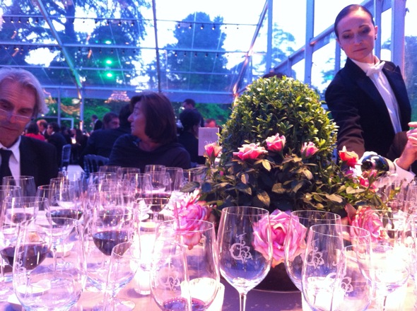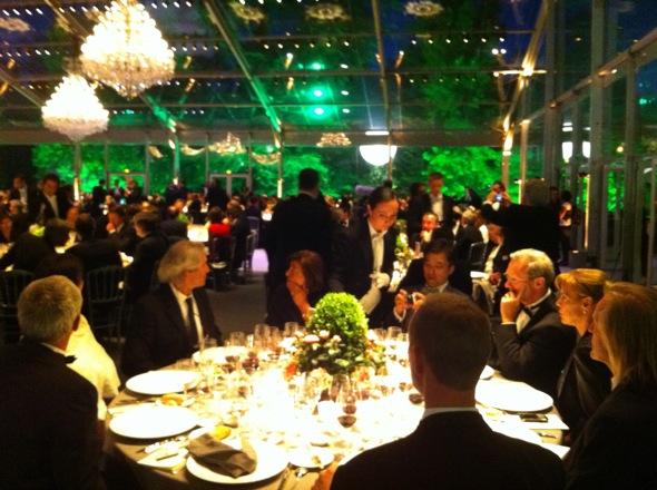 Ebenfalls ausgesprochen amüsant und kurzweilig war die Gesellschaft des Finnen Jouko Mykkänen, Columnist, Dozent und Sommelier in Helsinki. So eine unbekannte Tischrunde hätte ja im Zweifelsfall auch durchaus Langeweile aufkommen lassen können denn der Abend ging erst spät nach Mitternacht dem Ende entgegen. Doch weit gefehlt, ich habe mich gut unterhalten. Wozu nicht zuletzt die Form der Inszenierung beigetragen hat. Man beachte das Glaszelt und die Lüster, die Anzahl der Kellner die zusammen mit den drei Dreisterne-Köchen den Abend auf ein beachtliches Niveau gehoben haben, auch wenn man die Leistung der Küche für 350 geladene Gäste nicht damit vergleichen kann, für ein überschaubares Publikum in einem Gourmet-Tempel zu kochen. Das ist nicht Drei Sterne, aber fast, und das ist beachtlich. Zu Beginn übrigens spricht dann zunächst der Prinz, dann Alain Jupée, die Weine werden jeweils von geladenen Master-Sommeliers beschrieben, im Falle von Haut-Brion war es, glaube ich, Markus del Monego.