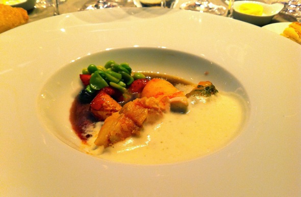 Also Lascombes und Lynch-Moussas 2003 zu einer Vorspeise von Alain Passard, 1996er Lascombes und 1985er Lynch-Moussas zu unten abgebildetem Hummer mit Erbsen und roten Früchten, einer Komposition von Anne-Sophie Pic.