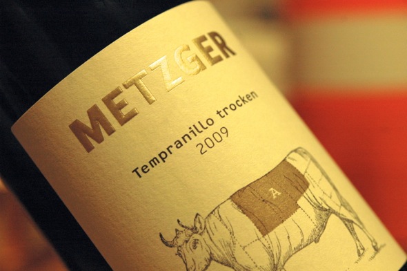 Kürzlich bin ich auf der Suche nach ungewöhnlichen deutschen Rotweinen auf den reinsortig ausgebauten Tempranillo von Uli Metzger gestossen. Andere Weine von ihm kanntw ich schon vorher und wenn man seine Weine irgendwo im Laden sieht, fallen sie auf. Das ungewöhnliche Flaschendesign sorgt dafür. Metzger hat, es ist nicht ganz weit hergeholt, das Rind, nein, den Bullen praktisch zum modernen Wappentier gemacht, und aus den besten drei Stücken die solch ein Tier hat, seine drei Qualitätskategorien abgeleitet. Was bei den anderen Gutswein/Qualitätswein, ist bei ihm Flanke, was sonst Lagenwein ist für ihn das Pastorenstück, was sonst Einzellage ist hier Filet – grob gesprochen.