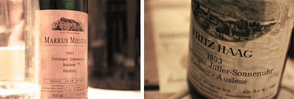 Natürlich gab es noch süßen Wein, schon um die Geschmacksnerven zu beruhigen. Zwei brillante, klare, mit jugendlicher Frische beeindruckende Rieslinge, die die nächtliche Runde irgendwann beendeten. Ich muss gestehen, meine Zunge war etwas müde und sie ist auch irgendwie beim Cheval Blanc zurück geblieben. Und doch, der Haag: Rieslingfrucht und Gummi in der Nase, dazu eine leichte, spürbare Süße, deutliche Orangenzesten. Am Gaumen leicht, frisch, klar, strukturiert mit feiner Schieferwürze. Der Molitor dagegen war etwas crémiger, buttriger, etwas süffiger mit einem schönen Spiel von Orangenfrucht, frisch und kandiert.
