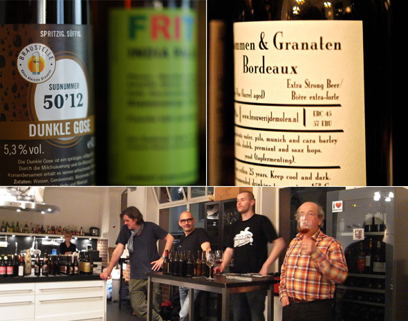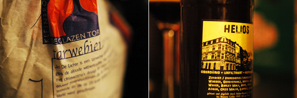 Zum Schluss gab es dann noch zwei wirklich besondere Biere. Offiziell das niederländische Bommen & Granaten, ein in Bordeaux-Fässern gereiftes, dunkles, starkes Bier aus dem Hause De Molen. Hier stecken etwas mehr als 15% Alkohol drin und das Bier dürfte laut Etikett mindestens 25 Jahre haltbar sein. Ein Bier, dass vor allem und nicht zuletzt nach Erbeerkonfitüre roch und schmeckte. Nicht ganz mein Fall aber ausgesprochen interessant. Ebenso das Mikkeller Black, off the record genossen, mit noch mehr Alkohol, noch intensiver, voller Bitterschokoladen- und Espressonoten, fast eine Zumutung an Intensität. Nach einem solchen Abend mit dieser Fülle an intensiven Geschmackserlebnissen, ist es das i-Tüpfelchen zu viel, auch wenn ich verlegen darum war, es probieren zu können. Zum Plausch fand sich dann ein kühles kölschartiges Getränk namens Helios – perfekt zum Entspannen des Gaumens, quasi der Reparatur-Riesling des Abends.