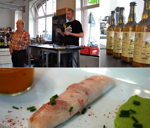 Der zweite Gang aus der Hand von Torsten Goffin war für mich der gelungenste: tagesfrisch geräucherte Forelle erster Güte, ein Erbsen & Minz-Parfait von angenehm cremiger Substanz und ein Shot aus dem Sud der Räucherforelle mit Bier und Espelette gekocht. Dazu eine Dunkle Gose, ein säuerliches Bier, welches traditionell in den Bereichen Goslar und Leipzig gebraut wurden und das heute in der Kölner Braustelle entsteht, Kölns kleinster Brauerei, die sich auf das Brauen historischer Biere verlegt hat. Mir hat dieses leicht milchsaure Bier ausgesprochen gut gefallen. Obergärig gebraut mit etwas Koriander und geräuchertem Hikoree wirkt es fast ein wenig salzig, mit einem leichten Apfelton. Danach, wieder aus der Feder von Sebastian Sauer, das Freigeist Abraxxxas. Es wurde im Stil einer Lichtenhainer Weiße gebraut und ähnelt etwas der Gose, denn es ist säuerlich und bekommt durch die Verwendung von Rauchmalz ein besonderes Aroma. Ursprünglich ein leichtes Bier, hatte dieses 6% Alkohol.