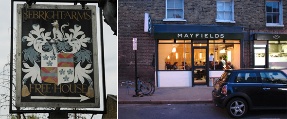 Eigentlich hatte ich gestern vor, mit Florian Siepert, mit dem ich gerade auf seiner Plattform Opentrips eine kleine Loire-Genussreise plane, während meines Messeaufenhaltes in London endlich mal im Upstairs at the Ten Bells Essen zu gehen. Der Laden gehört nicht nur zu Florians Lieblingsrestaurants, ich kenne noch ein paar andere, begeisterte Anhänger. Nun hat jedoch vor zwei Wochen eine neues, kleines, so genanntes Nachbarschaftrestaurant geöffnet, von dem Florian nur Gutes gehört hat und was er gerne kennenlernen wollte. Also sind wir ins Mayfields gegangen. Da ich mich an der Hackney Road einquartiert habe konnten wir nach einem Abstecher ins Sebright Arms zu Fuß durch den sommerlichen Abend schlendern. Das Mayfields hat sich in einer ehemaligen Kebab-Bude einquartiert und pflegt einen offenen und völlig unprätentiösen Stil, der mir sehr entgegen kommt. Es ist völlig egal, in welcher Aufmachung Du dahin kommst, die Kellner sind so normal drauf wie Du und ich, die Teller kommen nicht aus dem Designlabor sondern sind so angerichtet, wie ich das mit etwas Mühe auch schaffen könnte. Überhaupt wirken die ganzen Gänge so, dass ich den Eindruck hatte, ich könnte im Prinzip alles mit meinen Möglichkeiten replizieren. Die Küche ist einsehbar und ziemlich einfach ausgestattet. Hier wird Wert gelegt auf den kleinen Kick der Kombinationen, auf die Überraschung, die hier jede Platte bringt. Nachdem wir gestern die Hälfte der angebotenen Gänge geschafft haben, waren wir uns einig, dass dies ein Laden ist – der Chef kommt übrigens aus dem Ten Bells – den wir auf jeden Fall weiterempfehlen wollen. Fotos gibt es nicht viele, denn dafür war es zu dunkel. Perfekt war es auch nicht, sie können noch an ein paar Dingen feilen, aber sie sind eben auch erst seit zwei Wochen am Markt und erst auf dem Weg Top of the Pops zu werden.