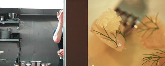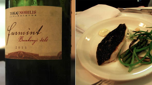 Etwas nichtssagend waren die beiden Spargelgänge. Der weiße Spargel war kalt angerichtet und mit Miso, Grapefruit und sehr hellem, geriebenen Käse von erstaunlich wenig Geschmack. Auch nicht wirklich begeisternd war der grüne Spargel mit Butt, Pil Pil und Limone. Da fehlte das gewisse Etwas, eben jener kleine Kick, der die Platte besonders macht. Ein wenig ärgerlich auch, dass das Stück vom Schwein, das mit Chicorée, Anchovi- und Mandelsauce gereicht wurde, etwas zu trocken war. Das hätte man in der Küche sehen können. Schade deshalb, weil die Anchovi- und die Mandelsauce eigentlich genial gut gepasst haben und eine ungewöhnliche Kombination darstellten. Um noch mal zu meckern: Der Sancerre-Rosé von den Vignobles Gitton Les Crilles war ein Reinfall. Viel besser der später gewählte Furmint 2009 Tokaj Nobilis – frisch und leicht trotz Holz, mit schöner Frucht und einer angenehmen, leicht bitteren Note.