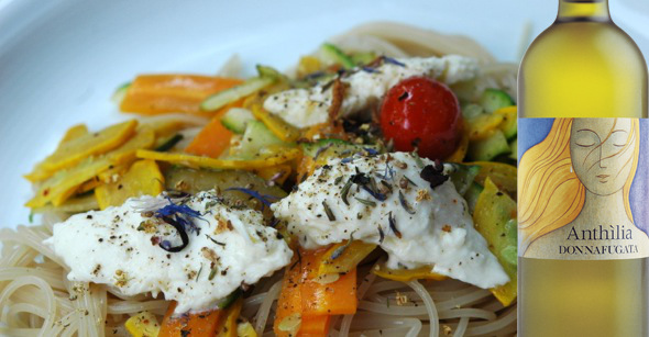 Und was gibt es als Weinbegleitung? Zu diesem italienischen Gericht habe ich mich für einen Wein aus dem Hause Donnafugata entschieden. Die Weine des Gutes mag ich nicht nurwegen ihrer Gestaltung. Die Qualität ist einfach gut. Nicht zuletzt bei den roten Weinen und den Süßweinen von der Insel Panteleria. Anthìlia besteht im Wesentlichen aus Catarratto, derWeißweinsorte, die in Italien nach Trabbiano am zweitmeisten angebaut wird, die aber trotzdem kaum jemand kennt. Sie kommt fast nur auf Sizilien vor und findet sich meist in Wermut und Marsala wieder. Dass man daraus jedoch einen blumigen, mineralischen, weißfruchtigen und säurebetonten Weißwein machen kann, zeigt sich hier beim Anthìlia.