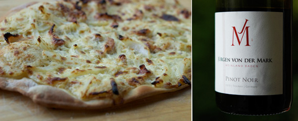 Gestern mittag im Büro erinnerte ich mich an den ausgesprochen gelungenen Flammkuchen eines Freundes, den dieser in rauhen Mengen zur Präsentation des Weinprojektes Mannwerk hergestellt hatte und sich dabei an einem Rezept der Lamiacucina orientiert hatte. Wie ihr selbst nachlesen könnt, braucht der Flammkuchen Zeit, also die Vorbereitung, denn der Kuchen wird mit Hefe gebacken. Es war klar, dass ich diese Zeit nicht haben würde, wenn ich um 18 Uhr zuhause einträfe. Es sei denn, wir hätten Flammkuchen als Nachtmahl zu uns genommen, doch das war nicht geplant. Bei der Suche nach einem Alternativrezept bin ich bei der Brigitte gelandet und der einfache Boden ohne Hefe war ein Volltreffer. Ich bin auch gar nicht so ein großer Fan von Hefe und dieser Boden war schmackhaft und ließ sich ohne Probleme genauso dünn ausrollen, wie ich es mag. Also 220 Gramm Weizenmehl, 100ml Wasser, ein Eigelb, drei Esslöffel Öl und etwas Salz. Das wars. Für den Belag gab es klassisch Crème fraîche mit Speck und Zwiebeln, vermengt mit Salz und Pfeffer. Köstlich. Ich habe übrigens, ich war etwas forsch bei der Sache, die doppelte Menge genommen, was zur Folge hatte, dass unsere Nachbarn auch noch mit Tarte flambé gesegnet wurden.