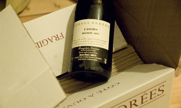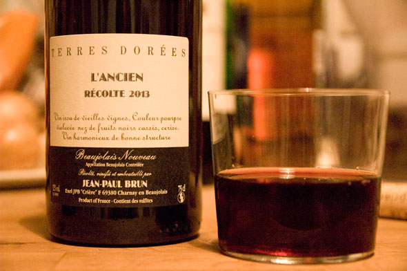 Ich habe danach kein Glas Beaujolais Nouveau mehr angerührt – 20 Jahre nicht. Ich hatte allerdings auch nie das Gefühl, dass ich wirklich etwas Entscheidendes verpasst hätte. Letzten Samstag dann habe ich bei den Wein-Rebellen die Weine für die kommende WRINT Weihnachtswein-Sendung abgeholt. Dort standen zwei Sorten von Beaujolais Nouveau. Und war der von Jean-Paul Brun, einem der besten Weinmacher dieses Gebiets (ich habe hier schon mal etwas mehr über ihn geschrieben). Einer der Weine sieht aus, wie so ein junger Spaßwein eben heute aussieht, bunt, mit Blumen drauf und mit einer leichten Restsüße. Der andere, der Terres Dorées L’Ancien 2013 sieht nicht nur aus wie ein seriöser Beaujolais, er hat auch die Anlagen dazu. Er hat nichts, aber auch gar nichts mit der Plörre zu tun, die den Ruf des Beaujolais über Jahrzehnte so nachhaltig beschädigt hat. Das hier ist zwar ganz junger Wein, und auch definitiv ein Spaßwein, aber einer, der es trotzdem in sich hat. Natürlich geht es um Frucht, aber nicht nur. Der L’Ancien riecht zunächst einmal nach frischem Brotteig (nicht nur nach Hefe) in den jemand eine aufgeschnittene Banane gerührt hat. Dann erst kommt die eigentliche Frucht. Das ist jetzt allerdings auch nicht so die übliche Erdbeer-Himbeer-Frucht die immer ein bisschen so schmeckt wie die Bonbons aus der Metalldose im Auto. Es ist eher Cassis, also etwas dunkler, fast ein kleines bisschen erdig und auf jeden Fall schmeckt der Wein außer Brotteig und Frucht nach Stein. Ist das schmackhaft? Ja, das ist es und zu einer Brotzeit mit kernigem Brot, guter Wurst und Käse ist das ein schöner Begleiter.