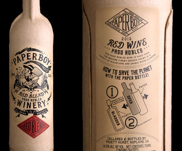 Doch zunächst bin ich im Design-Blog Lovely Package kürzlich über diese “Flaschengestaltung” gestolpert. Sie stammt von Stranger und Stranger, einer in London und New York ansässigen Agentur, die sich auf Flaschenausstattungen für den Getränkemarkt spezialisiert hat. Paperboy ist so grün wie möglich. Die Hülle wurde aus komprimiertem Recycling-Karton hergestellt und mit natürlicher Tinte bedruckt. Der Wein selbst befindet sich in einem recyclebaren Kunstoffgebinde, wie wir es aus der BagInBox kennen. Die Kartonage ist so beständig, dass man sie sogar über mehrere Stunden ins Kühlfach legen kann. Sie wiegt einen Bruchteil einer herkömmlichen Weinflasche, so dass der Transport deutlich günstiger ist und der Energieaufwand laut Agentur während der Produktion gerade einmal 15% von dem einer Glasflasche beträgt. Der Clou: das ist nicht etwa ein Prototyp sondern man kann diesen Wein bereits kaufen, bei Safeways in GB in den USA. Sicher keine Alternative für Margaux und Konsorten aber für einfachen Wein? Und es ist schließlich der einfache Wein, der massenhaft bewegt und verkauft wird.