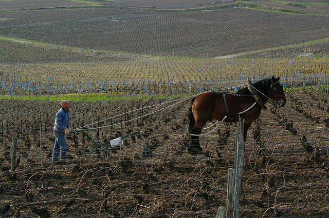 In zunehmend mehr Weinbergen wird wieder mit dem Pferd gearbeitet. Selbst bei einem so großen Haus wie Roederer. Doch das Pflügen mit den großen Gäulen will gelernt sein, wie hier, bei Tarlant. Creative Common License
