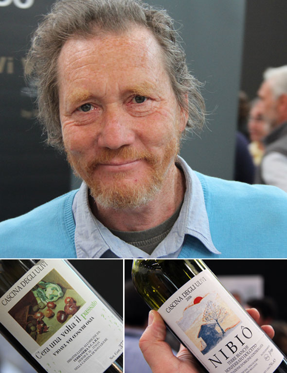 Stefano Bellotti, der Mann hinter diesem Wein, sorgt seit Mitte der Achtziger für einen konsequent gesunden Weinberg, er erntet die Trauben, die von den dortigen roten Tonerde stammen mit geringem Ertrag und vergärt sind dann spontan. Sie reifen daraufhin ein knappes Jahr auf der Feinhefe, und zwar in großen Fässern aus Akazienholz. Danach werden sie ohne Schwefelzusatz abgefüllt und verschwinden im Keller. Dort bleiben sie noch eine Zeit, so dass aktuell erst der 2011er Jahrgang auf dem Markt ist. Den hat Bellotti aber gar nicht mit auf die Vinitaly gebracht. Dort stand der 2007er. Das ist der, den er jetzt trinkt. Sieben Jahre ist dieser Cortese gereift, und das ist gut. Der wein wirkt tatsächlich auf den Punkt gereift, strukturiert, harmonisch, dabei mit perfekter Säure ausgestattet und entsprechend frisch. Der Wein trägt die für den Cortese typischen Mandelaromen mit sich. Danach übernehmen Birne und Quitte (der leicht oxydative Ausbau im großen Holzfass lässt grüßen). Dann treten Kräuter in den Vordergrund, Salbei meine ich gerochen zu haben. Dazu finden sich feine Grapefruitaromen und Stein. Die Länge ist phantastisch und bekam direkt Lust auf Gnocchi in Salbeibutter.