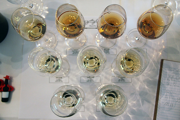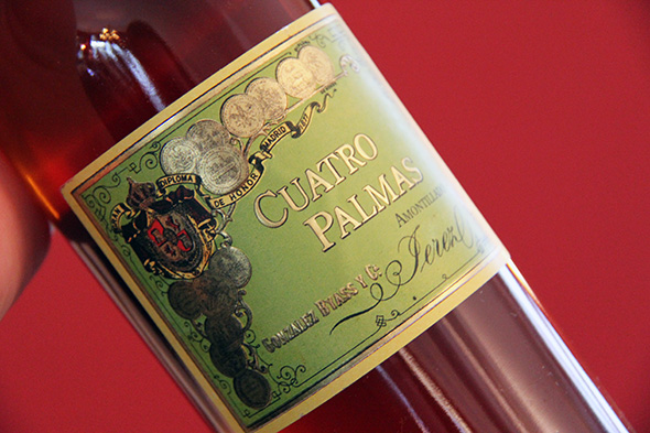 Am Anfang der Reihe stand der knalltrockene, leichte, kristalline Tio Pepe. Ein einfacher, blitzsauber gemachter Fino, den es für unter 10 Euro gibt und der nach Hefe und Apfel duftet und nur eine ganz kleine Spur nach grünen Nüssen. Er lag einige Jahre unter der Florschicht, bevor er abgefüllt wurde. Tio Pepe ist Fino auf gutem Niveau. Interessanter wird es beim Tio Pepe En Rama. Der Sherry durchläuft nicht so lange die Solera sondern wird jung und unfiltriert abgefüllt (während der Fino filtriert wird und kältestabilisiert wird). Der En Rama ist junger, wilder Sherry voller Hefe, Salz, Fenchel und Zitrus. Ich kann mir so etwas sehr gut zu Pata Negra-Schinken vorstellen, zu Fisch mit Zitrone vom Grill oder zu Artischocken. Was folgte war eine neue Serie von Sherry namens Una Palma, Dos Palmas, Tres Palmas und Cuatro Plamas, lediglich unterbrochen von drei Sherry, die ihr Leben als Fino unter der Deckschickt des Hefeflors verlassen haben oder von vornherein so ausgebaut wurden, um als Amontillado, Palo Cortado oder Oloroso weiterzuleben. Diese drei bilden zusammen mit dem Cuatros Palmas die obere Reihe der Gläser. Die Varianten Una, Dos und Tres Palmas sind Finos, die sechs, acht bzw. zehn Jahre gereift sind und deren Fässer Stück für Stück ausgewählt wurden. Die Farbe der Finos wird immer dunkler, sie wirken immer gereifter und, ich muss es klar sagen, sie werden mit jeder Palme großartiger bis sie mit dem Tres Palmas einen Reifegrad erreicht haben, wo die Hefen nichts mehr ausrichten können. Der Tres Palmas duftet wie karger, tiefer, dichter Walnusslikör, hat etwas Süße in der Nase und ist ausgesprochen cremig und lang am Gaumen. Gerade einmal ein Fass gibt es von diesem Wein, den man im Handel für ca. €35,- erwerben kann und der jeden einzelnen Cent wert ist. Was mich ebenfalls beeindruckt hat – bevor es zum Highlight des Nachmittags kam – war der Alfonso Oloroso. Das ist ein 8 Jahre alter cremig süßer Sherry, der nie ganz trocken ausgebaut wurde und direkt auf 18% Alkohol aufgespritet wurde. Da in diesem Bereich die Hefen nicht mehr arbeiten, hat er nie unter einer schützenden Fino-Schicht gelegen sondern ist im Laufe der acht Jahre, die er die Solera durchlaufen hat, oxydiert. Der Wein duftet nach getrockneten Früchten, Vanille und Holz. Er ist zwar leicht süß, hat aber letztlich nur 4.5 Gramm Zucker.