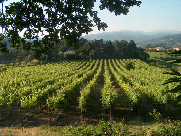 Dass Vinho Verde nicht deshalb so heißt, weil die Trauben grün, also noch unreif gelesen werden oder der weiße Wein grüne Reflexe zeigt, dürfte mittlerweile auch hier bekannt sein. Vinho Verde ist schlichtweg der Wein aus dem mit Abstand grünsten Gebiet Portugals, dem Minho, oberhalb von Porto an der Grenze zu Spanien. Zwar wird hier tatsächlich vor allem Weißwein erzeugt (und dieser hat auch gerne mal grüne Reflexe), doch hat Rosé und Rotwein eine ebenso lange Tradition. Nur findet man diese Weine hier selten bis gar nicht. Was man vor allem findet ist immer noch Mateus Rosé, der Wein in den Boxbeutelflaschen der geradezu zum Synonym für portugiesische Supermarktweine geworden ist, und dann findet man noch häufig Casal Garcia. Früher wurden die Weine mit dem markanten blauen Etikett ebenfalls in Boxbeutelflaschen angeboten, das scheint aber vorbei zu sein. Dieser Vinho Verde jedenfalls gehört zu den frühesten Weinen, an die ich mich erinnern kann. Es war ein Freund der Familie, der praktisch jeden Urlaub in Portugal verbracht hat und von dort immer auch diesen Wein mitbrachte – bis er den Lebensmittelhändler seines Vertrauens dazu bringen konnte, den Wein zu importieren.