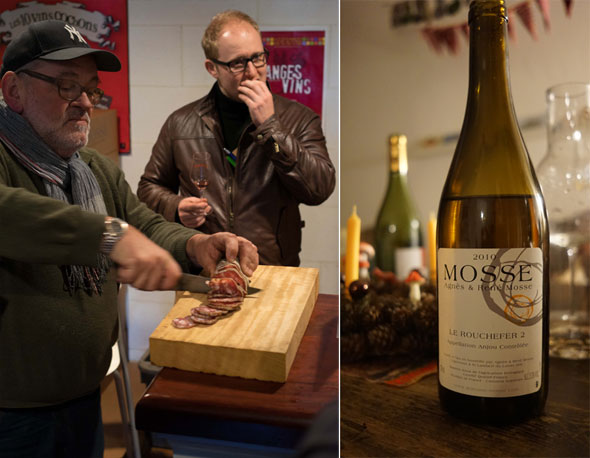 Irgendwann hat René eine Wurst herausgeholt, die er von einem befreundeten Winzer aus dem Beaujolais geschenkt bekommen hatte. Man muss ja schließlich was im Magen haben, wenn man die ganze Palette der Domaine durchprobiert. Hier mit Alex Zülch.