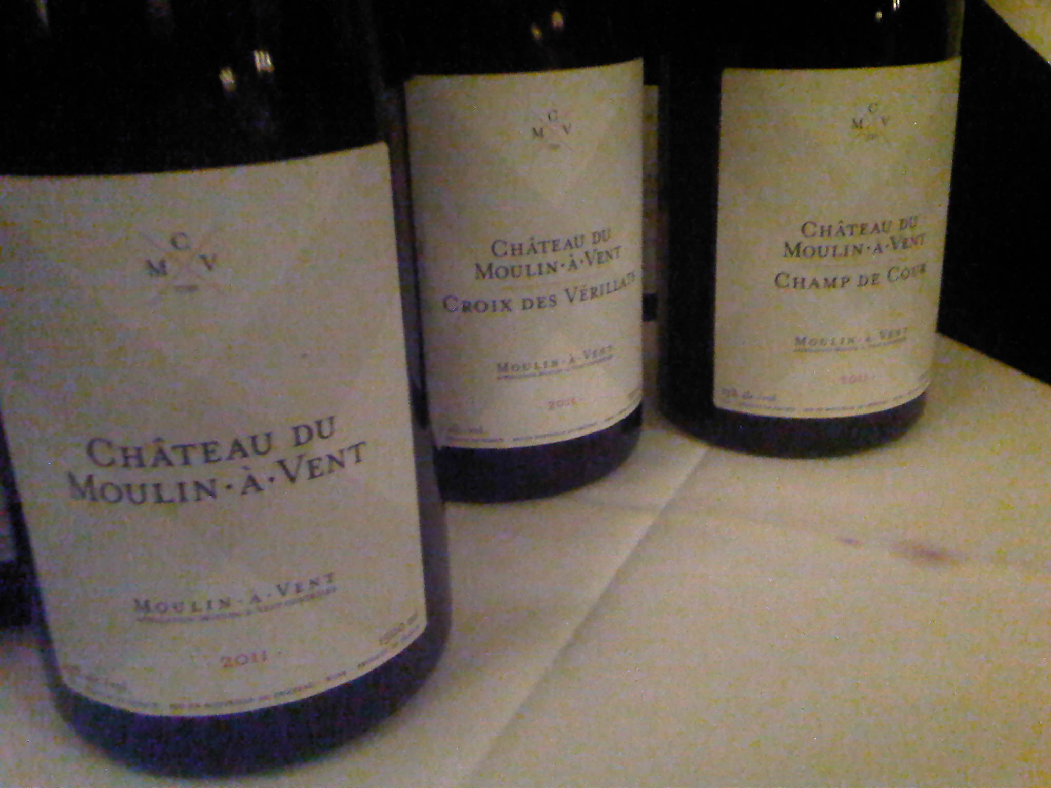 Zum Dessert hat das Château du Moulin-à-Vent keine Weine zu bieten, aber nach dem Dessert probierten wir noch den 2012 Pouilly-Fuissé Vieilles Vignes aus zugekauften Trauben und den 2012 Moulin-à-Vent La Rochelle. Die Trauben für den Pouilly-Fuissé kaufen die Parinets von einem Winzer zu und bauen ihn eher fruchtbetont aus, ohne nennenswerten Holzeinsatz mit Fokus auf die Frucht und die Frische. Der 2012 La Rochelle war zum jetzigen Zeitpunkt noch etwas schwer einzuschätzen, die Konzentration der Aromen ist immens, hier ist enorm viel Stoff drin, durchaus eine präsente Säure, Tannin, eine sehr dichte Frucht. Der Wein wird aus meiner Sicht Jahre brauchen, bis er sich wirklich öffnet, aber die Anlagen sind hervorragend.