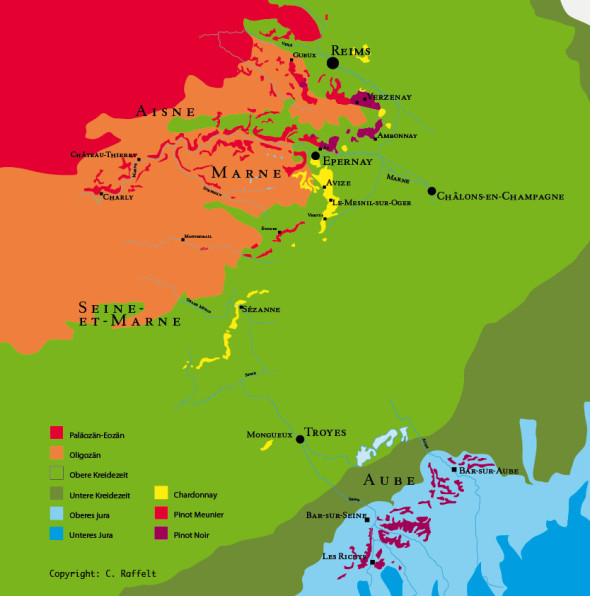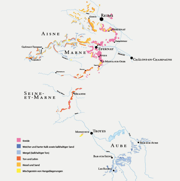 Die Champagne in ihrer heutigen Form ist Teil des Pariser Beckens und somit Teil einer über Millionen Jahre erfolgten Aufschichtung von Sedimenten, die vielfach mit Versteinerungen früher Lebensformen angereichert ist. Diese Sedimentbecken, von denen das Pariser als archetypisch gilt, entstehen, wenn sich rundherum Gebirge auffalten und das Becken organisches Material ansammelt. Im Falle des Pariser Beckens ist es so, dass es sich zum Kanal hin öffnet (auf der anderen Seite des Kanals findet man dann gleiche Kalk- und Kreidevorkommen wie in der Champagne) und auf der abgetrennten südostenglischen Seite fortgeführt wird, während das Massif Armoricain, das Massif Central, der Morvan, die Vogesen, die Ardennen und das rheinische Schiefergebirge die Grenzen bilden. Die tiefsten Schichten der Sedimentbecken liegen 3.000 Meter tief und sind meist die härtesten und am dichtesten zusammengepressten, während die oberen Schichten häufig sandig und schluffig sein können. Im Pariser Becken, dessen tiefste Ausläufer bin an die Obermosel um Perl herum reichen, finden sich mindestens acht Schichten, von denen fünf die Champagne direkt betreffen. Die ältesten Schichten in Luxembourg und Obermosel sind Sandsteinschichten aus dem Trias (245–195 Mio. Jahre), dann folgen die Kalksteinschichten aus dem späten, mittleren und jüngeren Jura (195–135 Mio. Jahre), die von der Mosel bis zum Chablis und Bar-sur-Aube reichen. Die nächste Schicht aus der älteren Kreidezeit (135–96 Mio. Jahre) liegt oberhalb der Côte-des-Bar in jenem Bereich der Champagne, in dem kein Weinbau stattfindet, während die jüngere Kreidezeit (96–65 Mio. Jahre) sich in den Böden von Montgueux über Épernay bis Reims ausdrückt. Westlich von Épernay im Tal der Marne finden sich Ausläufer des Paläozän (65–55 Mio. Jahre), während sich vom Massif-de-Saint-Thierry über die Île de France bis nach Paris die jüngste Schicht, das sogenannte Oligozän (36–24 Mio. Jahre), zieht. Somit befinden sich innerhalb der Champagne fünf Schichten mit vier Bruchkanten, die man in den Böden des Gebietes wiederfindet und zu denen natürlich bestimmte Rebsorten passen, die die Eigenheiten der Böden deutlich widerspiegeln.