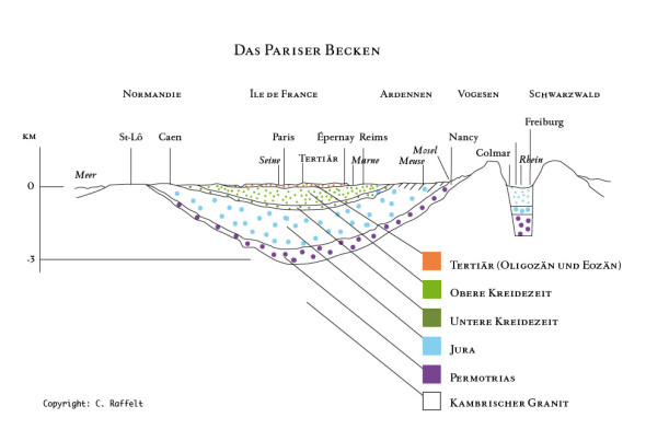Auf der bereits erwähnten Ton- und Lehmschicht liegt hier der jüngere Mergel, durchzogen von sogenanntem Mühlstein, einem dichten, teils porösen Stein aus Kalk und Silit, der in Paris gerne zum Bauen verwendet wird.