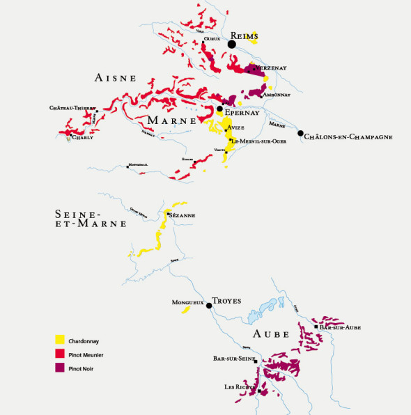 Ohne Zweifel gehört die Champagne zu den großen Wein-Terroirs, die Frankreich zu bieten hat. Doch besteht die Champagne natürlich längst nicht nur aus Kalk und Kreide, wie es häufig kolportiert wird. Allein die heute gebräuchliche Unterteilung in Sub-Appellationen deutet schon darauf hin, dass wir es mit einem komplexeren Zusammenspiel von Boden und Mikroklima zu tun haben. Wenn man auf die Karte der angebauten Rebsorten schaut, wird auch schnell klar, dass sich bestimmte, fast reinsortige Zonen gebildet haben. Die wahrscheinlich berühmteste davon ist die Côte des Blancs, in der auf oft reinen Kreideböden zu 95 % Chardonnay wächst. Nicht weit davon entfernt aber, im südöstlichen Teil der Montagne de Reims, findet sich ein ähnlicher Boden, auf dem fast ausschließlich Pinot Noir wächst. Entlang des Vallée de la Marne gen Westen wird der Bestand an Pinot Meunier immer dichter, während ganz unten im Südosten des Gebiets der Pinot Noir wieder deutlich die Oberhand hat. Die Sub-Appellationen Montagne de Reims, Vallée de la Marne, Côte des Blancs und Côte des Bar sowie die kleinen Zonen Montgueux, Vitry-le-Francois, Côte de Sézanne oder auch das Massif de Saint-Thierry geben zwar einen Hinweis auf unterschiedliche Stilistik und Voraussetzungen, die wirklich entscheidenden Bruchkanten innerhalb der Champagne jedoch verlaufen teils woanders.