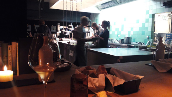 Was diesen Ort neben dem außergewöhnlichem Speise- und Getränkeansatz aber so besonders macht, ist die Ruhe, in der hier die Kraft liegt. Der Raum ist dunkel und lediglich die tiefe Bar, an der in einem U mindestens Dreiviertel der möglichen 40 Gäste sitzen, wird über warmes Licht illuminiert. Dann natürlich die Küche, um die das U gebaut wurde: dort im Kraftzentrum, in das jeder Gast vollen Einblick hat, geht jeder ganz ruhig und konzentriert zu Werke. Das Meiste ist längst am Nachmittag geschehen, es wird noch aufgekocht und angewärmt, wenige Teile frisch geschnitten und natürlich angerichtet. Die Choreografie fasziniert und strahlt Ruhe aus. Neben dem Gastgeber Billy Wagner, lernen wir nach und nach alle Beteiligten einzeln kennen, denn die erklären uns, was sie im Einzelnen angerichtet haben und wo es herkommt. Sie sind dabei genauso umsichtig wie der Gastgeber selbst. Man fühlt sich richtig aufgehoben an diesem Ort, der das Lokale mit Ansätzen skandinavischer Küche und der Ruhe und Spiritualität des Zen-Buddhismus verbindet. Da haben Billy Wagner und Micha Schäfer etwas sehr Außergewöhnliches geschaffen, etwas, was tief im Inneren glücklich macht.