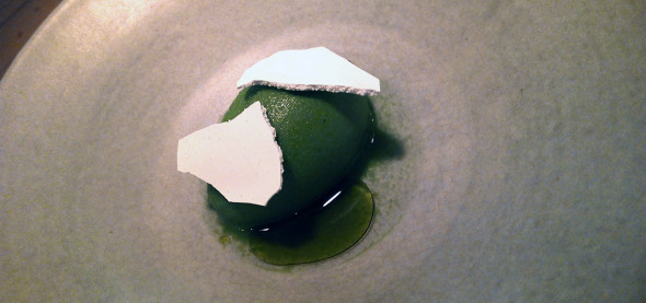 Die Küche bleibt immer leicht und schwebend. Fleisch wird nur in übersichtlichem Maße serviert. Hier ein Klecks Blutwurst, da eine Lammreduktion, schließlich der Schweinenacken. Lokalen Fisch von der Müritz (Saibling und Forelle) gibt es in zwei Gängen und hier, wie beim Fleisch sind es vor allem die Kombinationen mit Sprossen, Gräsern, Blättern, Blüten und Samen, die alles verbinden und heben. Entsprechend sind wir zur Menüfolge ohne ein Glas Rotwein ausgekommen, was ich durchaus angenehm fand, wird es doch schnell zu schwer, wenn man mindestens acht Getränke probiert. Geradezu sensationell gut wurde es bei den beiden ausklingenden Dessert-Gängen. Sauerampfer und Dillblüten treffen auf Traubenkernöl und einen Brand von der Chicorée-Wurzel, Grüner Hafer wird mit Rhabarber und Thymian kombiniert.