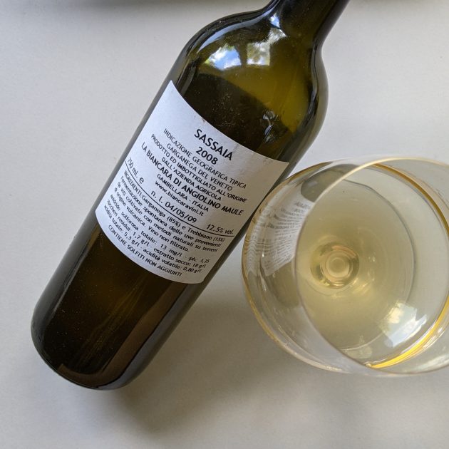 Den Wein, den ich nun recht lange im Keller liegen hatte, ist der 2008er Sassaia. Der wurde 1988 zum ersten Mal gefüllt und ist der erste Wein des Weinguts. Es ist eine Cuvée mit 85 % Garganega und 15 % Trebbiano. Was damals, also im Sommer 2009 noch völlig ungewöhnlich war, war die Angabe aller Parameter des Weines. So kann man auf dem Rückenetikett nicht nur den Alkoholgehalt lesen (12,5 %), sondern auch die flüchtige Säure (0,8 g/l), die Gesamtsäure (5,3 g/l), den Trockenextrakt (18 g/l), den Restzucker (1,8 g/l), den pH-Wert mit 3,35, sondern auch den Gesamtschwefelgehalt von 13 mg/l. Ausgebaut wurde der Wein nach spontaner Vergärung im 30-Hektoliter-Holzfass ohne Temperaturkontrolle. Vor der Füllung wurde nicht filtriert, geschönt oder Schwefel hinzugegeben. Die Flasche wurde mit Korken verschlossen.