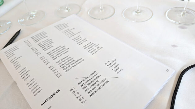 Am Roten Hang geht es los mit dem Gunderloch 2023 Nackenheim Rothenberg. Der Wein wirkt noch zurückgenommen, leicht würzig mit Curryblatt, blondem Tabak und Gestein. Dazu gibt es einen roten Apfel und weiße wie rote Beeren. Am Gaumen wirkt der Wein elegant und saftig mit gutem Extrakt. Nach den vorherigen Weinen vermisse ich hier ein wenig den Säuredruck. Aber die Balance des Weines gefällt mir eigentlich gut. Der Kühling-Gillot 2023 Nackenheim Rothenberg wirkt dunkelwürzig und extraktreich in der Nase und dann auch Gaumen. Tatsächlich ist hier viel dunkler Stein, dazu Extrakt, viel Grip und Festigkeit vorhanden. Dazu gibt es eine feine Saftigkeit. Da schlummert noch fiel in der Tiefe. Der Gunderloch 2023 Nierstein Pettenthal schließt stilistisch an den Rothenberg an. Das ist ein tiefer, ruhiger Fluss mit einer eleganten Frucht, einer leichten Nussigkeit und sinnlichen Säure, etwas Extrakt und dunklen Würzigkeit. Der Kühling-Gillot 2023 Nierstein Pettenthal strahlt in der Kombination von Blüten, Verbene, Tabak, Zitrus und etwas Kernobst. Das ist glockenklar, vibriert am Gaumen, zeigt Spannung, Energie und viel Gesteinswürze. Der Kühling-Gillot 2023 Nierstein Hipping ist tief, komplex, fein und bringt einen feinen Schmelz an den Gaumen. Es gibt gelbe Birnen und Pflaumen, gelben Tee, etwas Rauch und feuchten Stein. Am Gaumen wirkt der Riesling sinnlich, seidig und saftig, dann zunehmend gesteinswürzig und immer purer mit einer fein ziselierten Säure und beeindruckender Länge samt Salzigkeit. Der Kühling-Gillot 2023 Nierstein Ölberg wirkt dagegen zunächst zurückgenommener, ist feingliedriger, heller und floraler Riesling. Am Gaumen zeigt der Wein dann viel Saft, wirkt lebendig, rund und seidig. Der Wein ist ein Charmeur mit einer guten Balance von Frucht und Extrakt. Und je mehr man sich dem Finale nähert, desto salziger und pikanter wird der Wein.