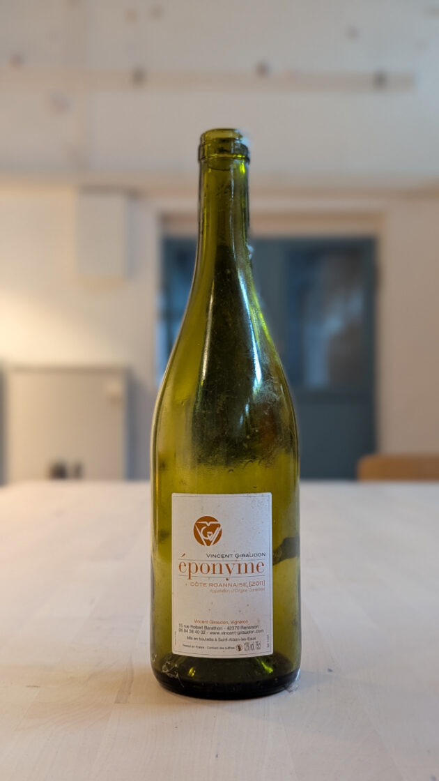 Nicht aber den 2011er Éponyme von Vincent Giraudon. Vincent hat mir diese Einzelflasche bei meinem Besuch vor zwei Jahren in die Hand gedrückt. Der Großvater des jungen Winzers war einst Sommelier im Hause Troisgros in Roanne und mit ihm hat Vincent als Jugendlicher seine ersten guten Weine getrunken. Vincent ist zunächst Koch geworden und hat bis 2019 im Restaurant seines Vaters gekocht. Doch hat er parallel ab 2004 die ersten Parzellen erworben. Der „Éponyme“ ist ein Gamay aus den Côtes Roannaise ohne Holzeinsatz. Genutzt wurde Beton und Amphore. Der Wein stammt also aus der gleichen Ecke und wurde mit einem ähnlichen Ansatz wie der Domaine des Pothiers „Diogène“ erzeugt, nur dass er neun Jahre älter ist und es natürlich auch noch andere Unterschiede gibt. Der entscheidende war, dass der „Éponyme“ eine wunderbare Spannung und Frische in sich trug. Das war für mich ein exzellenter Gamay und für alle(?) der Wein des Abends, weil er so stimmig war in sich. Ein zeitloser, tonischer, durchaus komplexer, dabei vitaler Wein, der einfach große Freude bereitet hat.