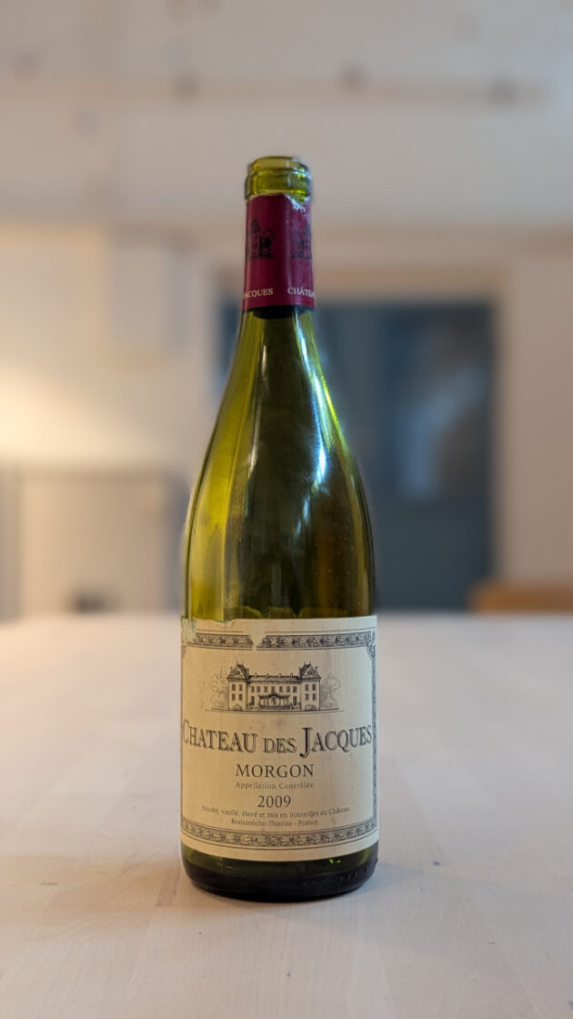 Zum klassischen Abschluss hatten wir einen 2009er Morgon des Château des Jacques, das zu Louis Jadot gehört. Eigentlich ein Wein, der noch locker auf der Höhe sein sollte, zumal er aus einem für Beaujolais sehr guten Jahrgang stammt. Doch dem recht dichten Gamay mangelte es an Frisch und Lebendigkeit, dafür hatte sich eine unangenehme Schärfe eingeschlichen.