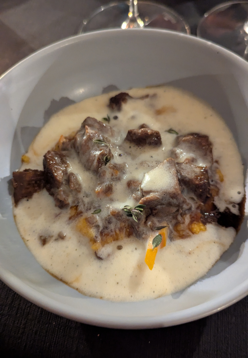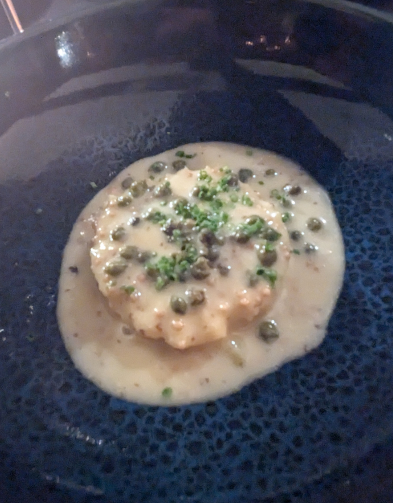 Zwei faszinierend schöne, klare, brillante Weine. Dazu gab es auf Salz gebackenen Sellerie, mehrere Tage „abgehangen“, mit Kapern, Gurke, Eigelb und geschmorten Schalotten sowie Gemüse-beurre blanc.