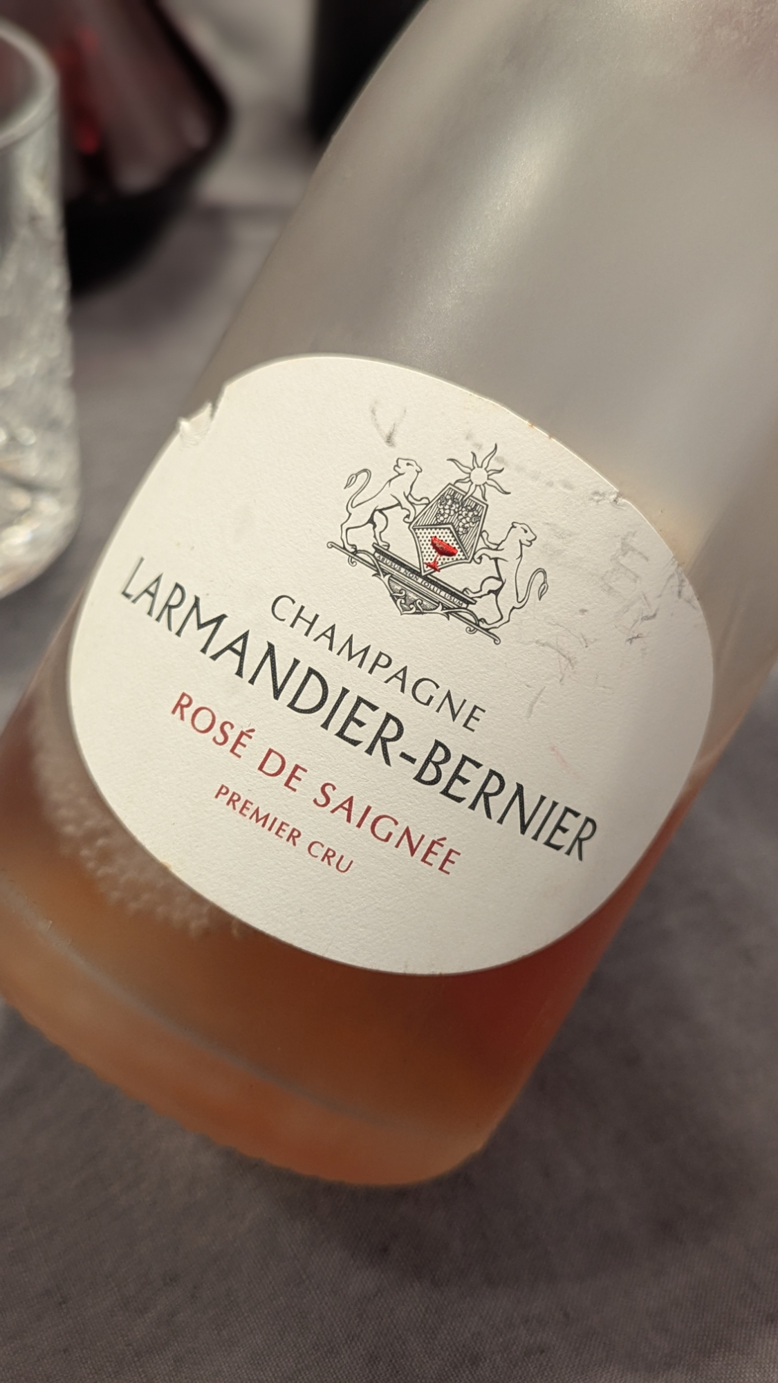 Als Entrée gab es einen zehn Jahre alten Rosé de Saignée 1er Cru Extra Brut von Larmandier-Bernier in erdbeerfarbenem Gewand. Der hat sich sehr schön entwickelt und das etwas sehr Feste, was er in jungen Jahren gerne hat, abgelegt. Stattdessen gibt es Waldbeeren, Erdbeeren, etwas Laub, Hefe, Brioche. Kein eleganter Wein, eher bodenständig, aber gut. Ist ja auch als Begleitung zum Essen gedacht.