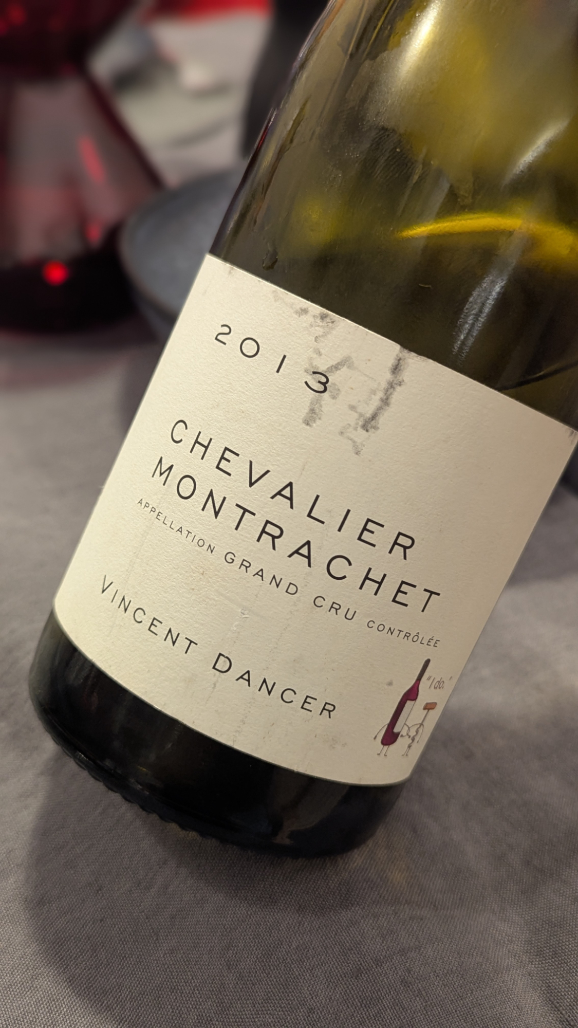 Die Montrachet-Probe ging los mit einem 2013er Chevalier-Montrachet von Vincent Dancer. Damals 62 Jahre alte Reben, 18 Monate ausgebaut (laut Etikett). Dieser Wein sollte sich nach Meinung aller, wenn ich mich nicht irre, als der beste Wein des Abends entpuppen. Typisch ist das nicht, meist ist man ja am Anfang etwas vorsichtiger mit Lob, aber hier war es komplett gerechtfertigt. Ein großartiger Wein mit einer perfekten Mischung aus Frische und Generosität. Alles ist da, aber nichts zu viel: zitrische Noten, Zesten, Nüsse, etwas Holz, Hefe, Brioche. Am Gaumen ein schöner Druck mit einer straffen Säure und viel Energie, Saft und feinster Frucht. Wieder generös und auskleidend, dabei elektrisierend mineralisch mit mundwässernder Salzigkeit. Klar und transparent, präzise, mit einer Mischung aus heimischer Frucht, etwas Ananas und Zesten. Der Wein wirkt so zeitlos, als könnte er ewig auf diesem Niveau verharren.
